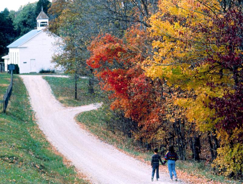 A couple enjoys a walk through the autumn leaves along the Ohio River. Copyright 1999 Jim Keith